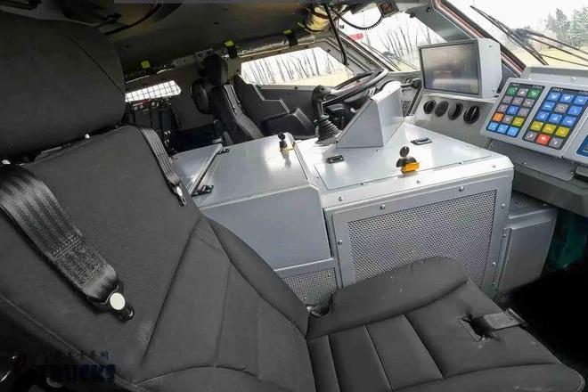 对于这种特殊消防车而言,看内饰其实没啥意义,不过还是例行看看。本车的驾驶室主打一个工业风,各类五花八门的控制面板塞满在仪表台上,用来控制车辆的各种功能。绝大多数功能都由电子系统控制,这也为远程操作带来了便利。