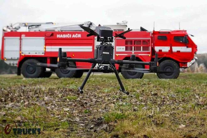火场情况复杂,光靠车辆本身的通信能力并不稳定,随时可能失去对车辆的控制。为了增强通行能力,CZVS 40消防车还可配备无人机通信中继系统,看样子就是大疆经纬M350无人机挂了套通信中继基站。当然,结合不同的载荷,这台无人机还能实现不同的功能,为灾难救援提供便利。