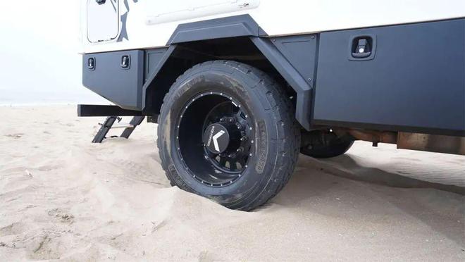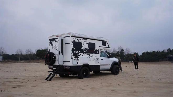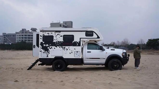 基于道奇公羊RAM 4500 4×4底盘打造,搭载6.4L V8汽油发动机,最大功率272kW,峰值扭矩582N·m,匹配6AT变速箱与分时四驱系统,动力输出强劲且平顺。前双叉臂式独立悬挂与后钢板弹簧的组合,兼顾操控性与承载能力;30°接近角与28°离去角的设计,配合LT295/65R20全尺寸越野轮胎,可轻松征服砂石路、泥泞地等非铺装路面。此外,底盘在欧洲服务网络完善,尤其适合亚欧长途穿越。