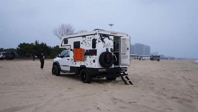 康派斯道奇公羊RAM 4500房车延续了美式皮卡的肌肉感设计语言,整车尺寸为5995×2480×3000mm,轴距3670mm,接近角30°、离去角28°,最小离地间隙240mm,轻松应对崎岖山路与泥泞小道。车身采用低饱和度配色(如米黄色或深灰色),搭配棱角分明的线条与防撞杆、绞盘、拖车环等越野套件,彰显出强烈的进击感。车顶配备行李架与长条越野探照灯,尾部外挂式备胎与储物箱的组合进一步强化了户外属性,而6路监控摄像头与智能门锁则提升了安全性。