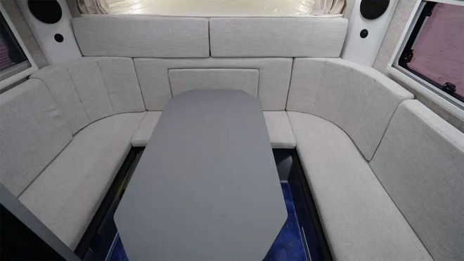 会客区:U型沙发可容纳4-6人,中间升降桌板降下后可拼接为2137×1122mm双人床(部分车型增设上铺),满足3-4人睡眠需求。沙发两侧配备通风窗与洞洞板置物架,兼顾采光与收纳。储物系统:沙发背面、车门两侧及顶部均设有储物柜,可存放衣物、工具等物品;部分车型配备机械表盘式水电显示系统,实时监控资源使用情况。